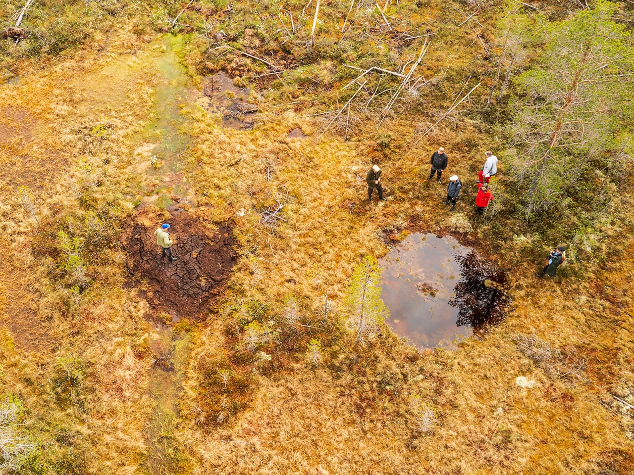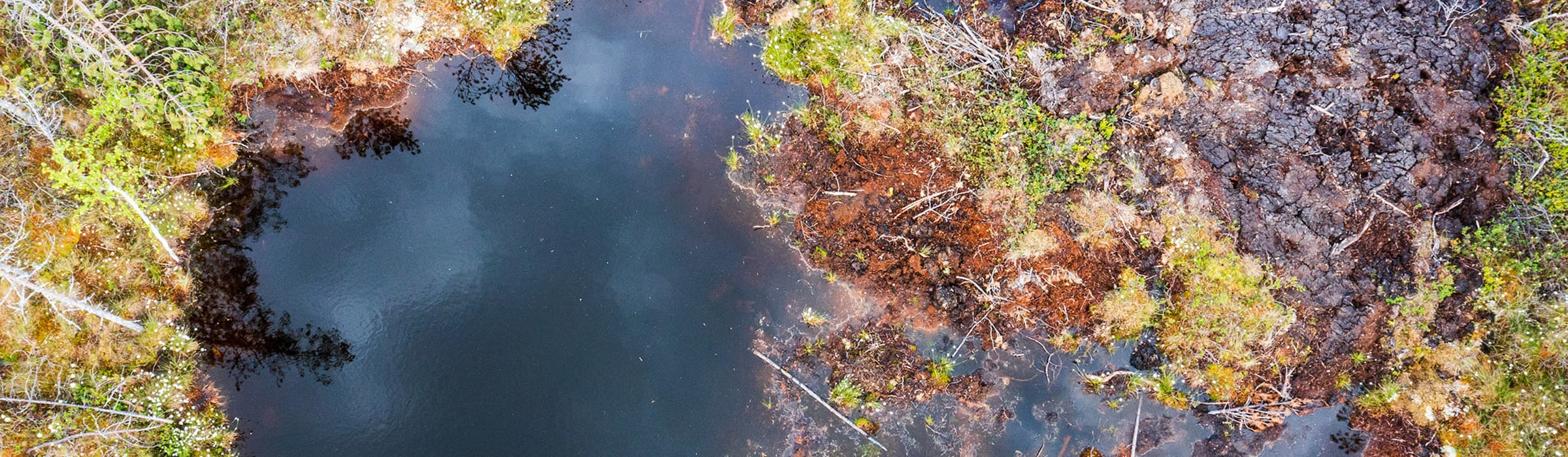 Kuvassa yksi ison piitsonsuon padoista ja sen viereinen kuoppa, johon on jo alkanut kasvaa rahkasammalta.